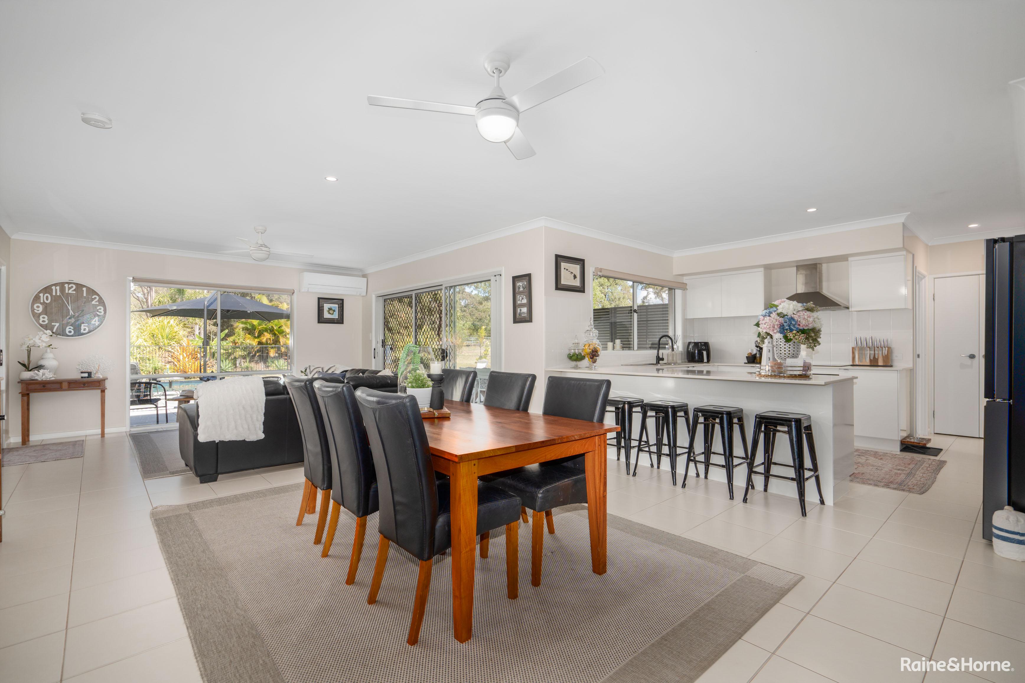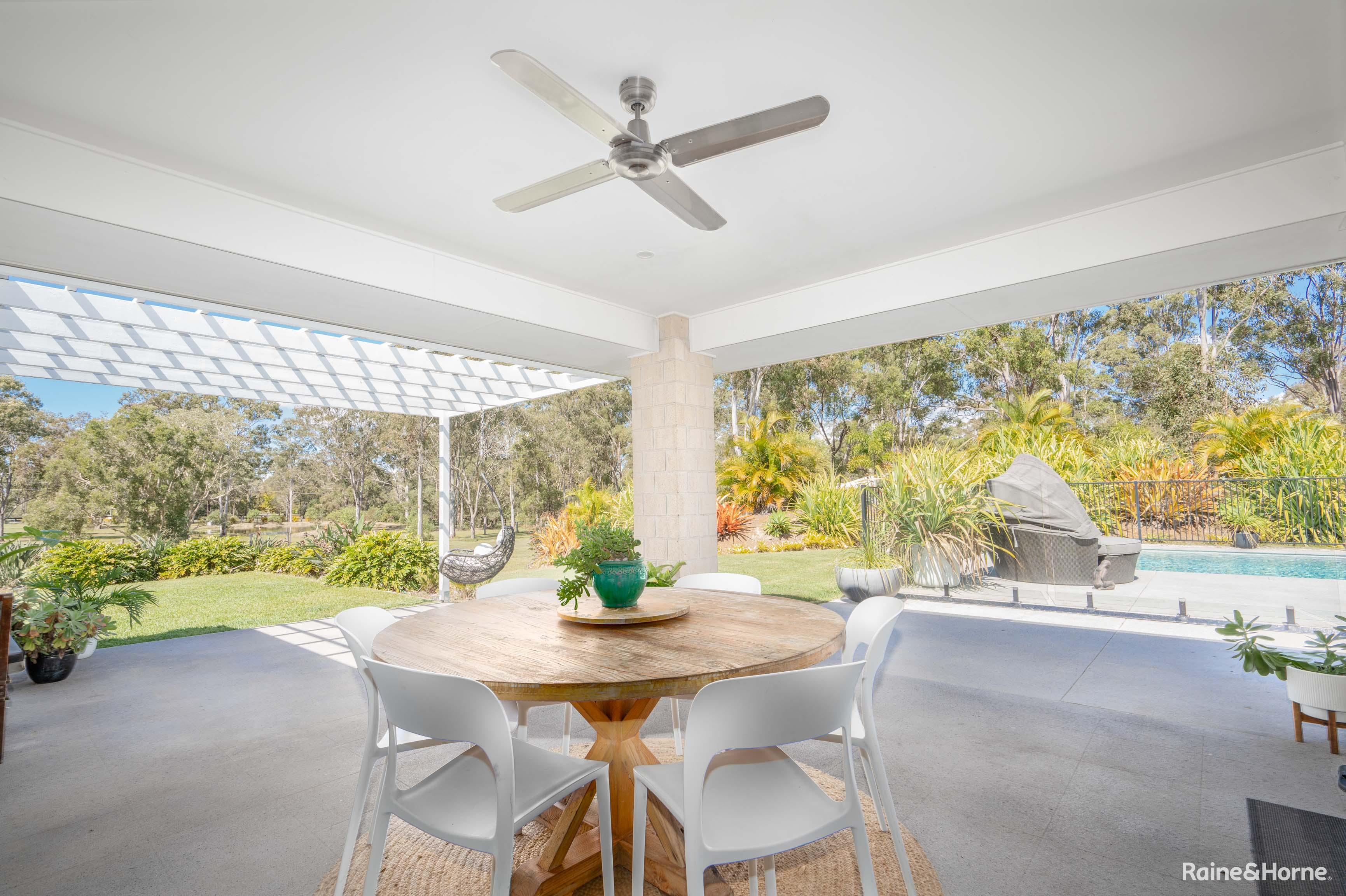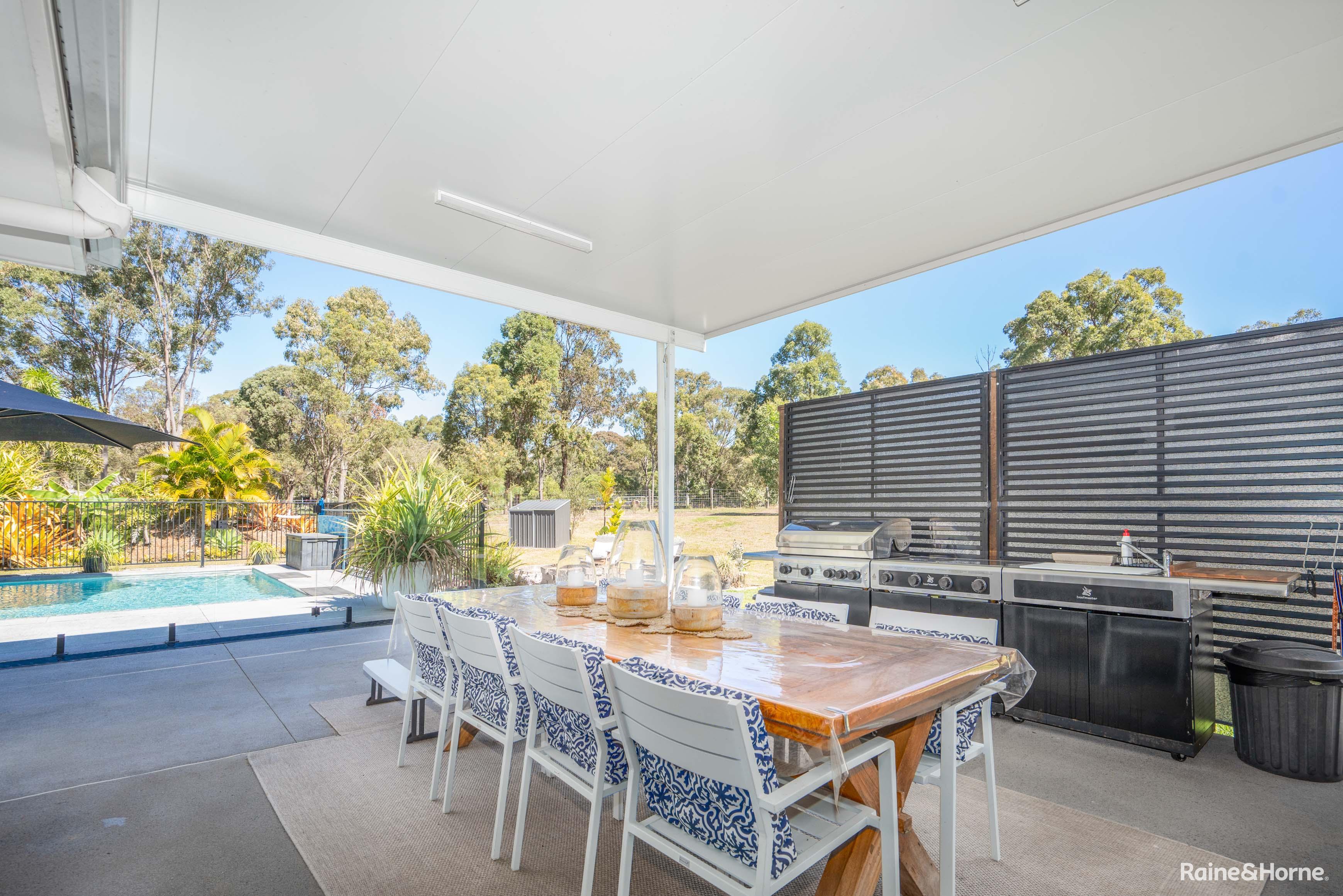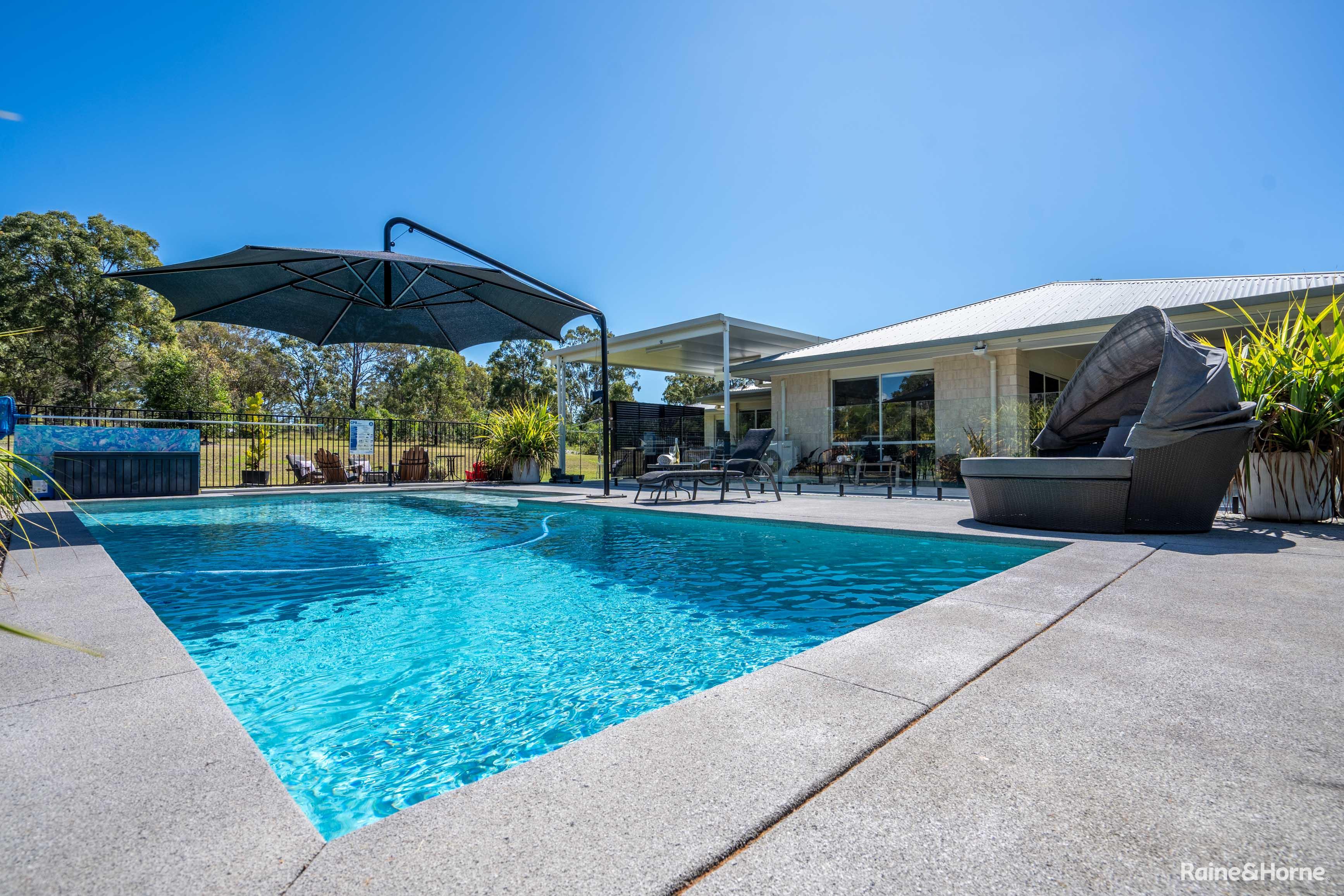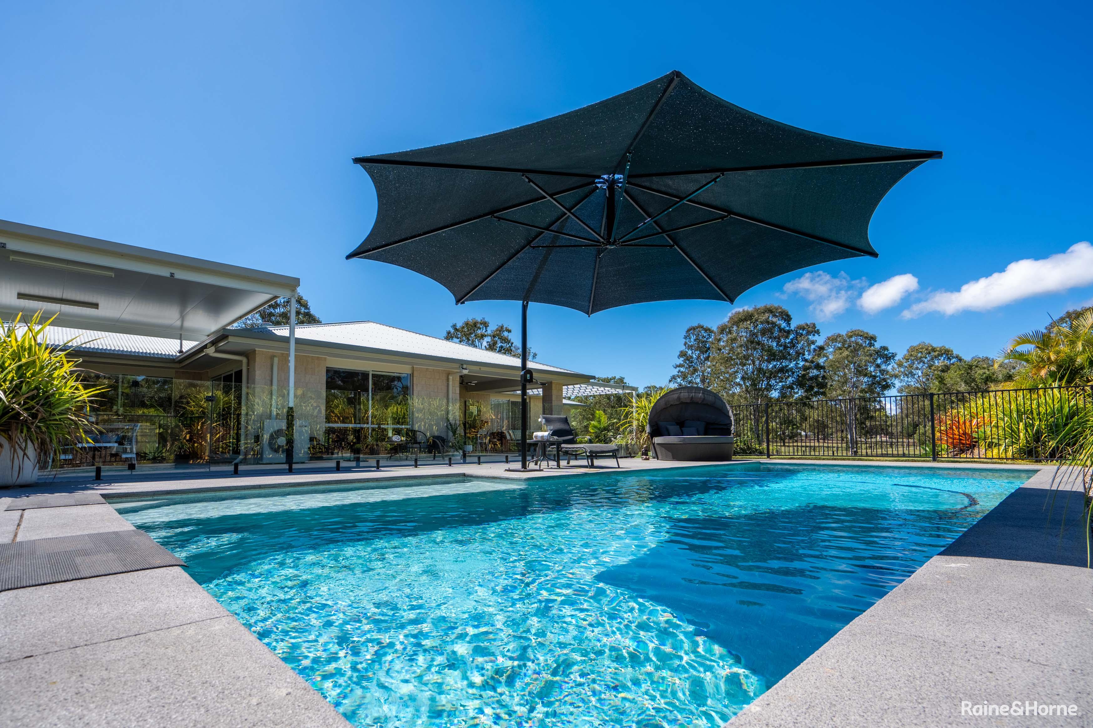 High ceilings and quality fixtures are found throughout, with beautiful built-in cabinetry enhancing the lounge and parents' retreat. The insulated 7x6m alfresco dining and BBQ area is perfect for outdoor entertaining, offering expansive views of the property and the 10x4m in-ground saltwater swimming pool, complete with a shade umbrella.